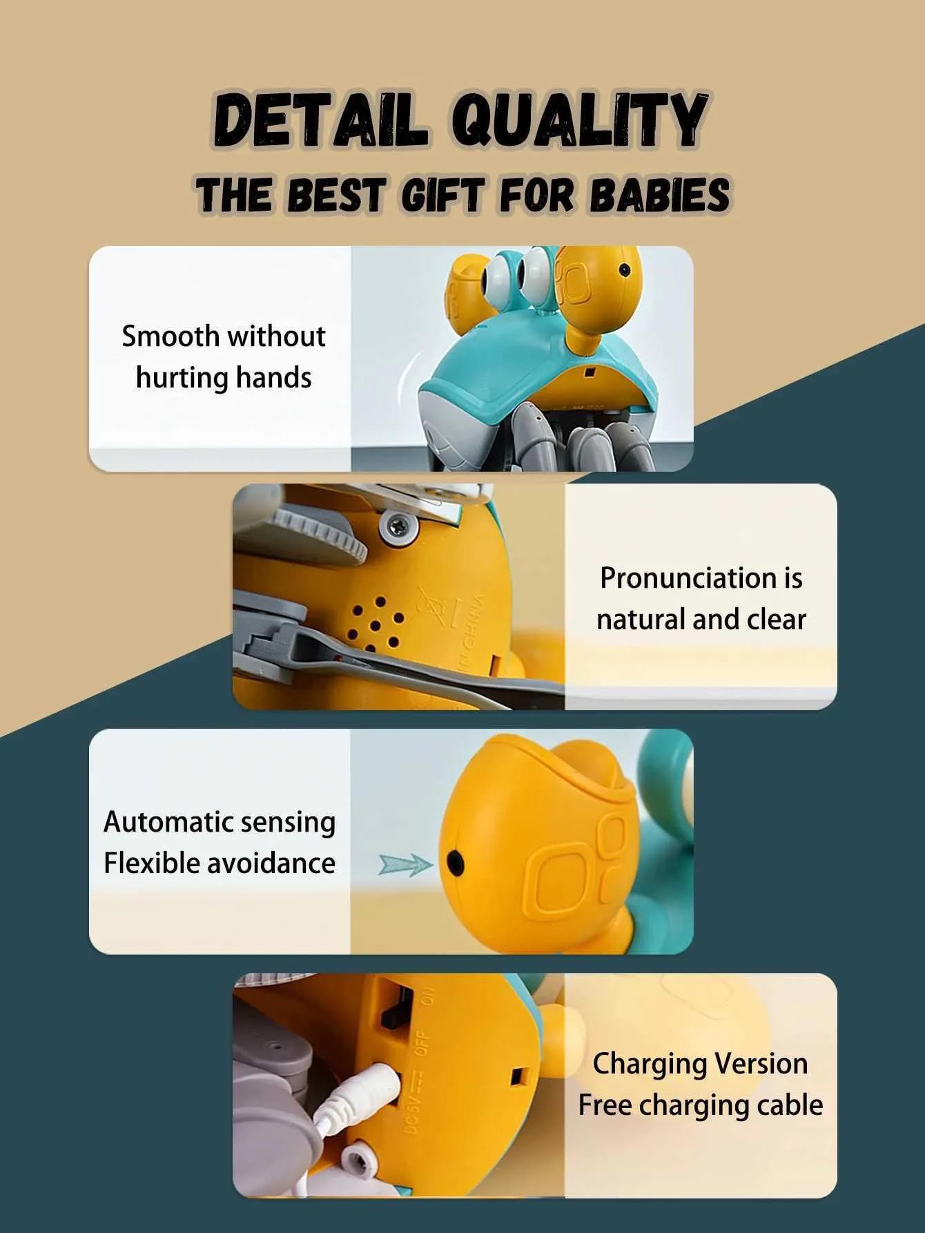 - 🦀 Smart Motion Sensing & Interactive Play This crab toy moves quickly and automatically changes direction when it encounters obstacles—just like a real crab! Your baby will love chasing it around, which helps develop motor skills, hand-eye coordination, and encourages physical activity. It even encourages babies to sit up or stay in a sitting position for longer periods of engaging play.